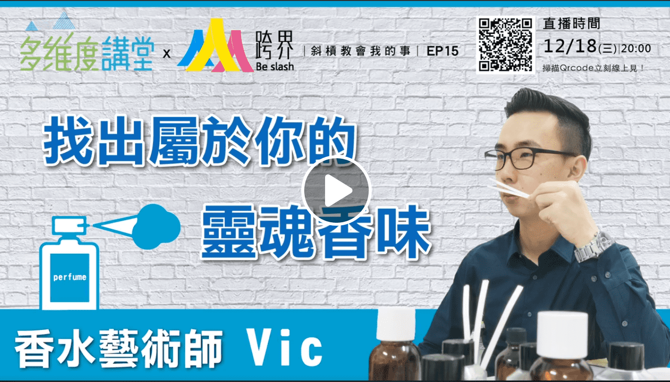 香味是一門隱幽,但深邃的學問。擁有多國證照的Vic老師,在講座中會先以優雅流暢的解說,輔以細緻貼心的實作,帶領學員走入法式調香的迷人世界。是一門身心靈都深受療癒的課程。